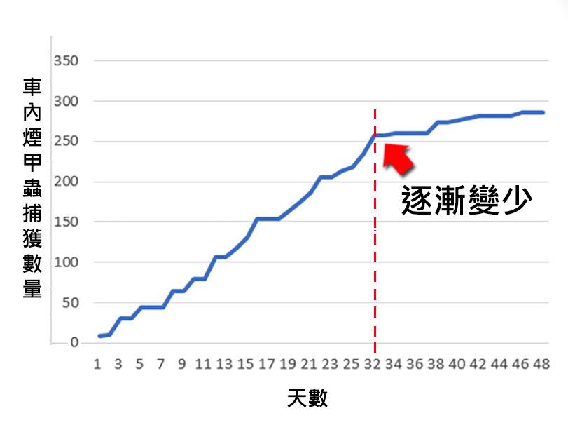 針對煙甲蟲入侵轎車,福爾摩斯有進行過防治實驗,數據如圖 3 所示。這是某客戶之高檔轎車內所發生的狀況,客戶其實只是在某次開車途中發現有一隻小甲蟲在眼前慢慢飛過,停車逮到這隻小甲蟲後,洽詢福爾摩斯確認是「煙甲蟲」,並接受福爾摩斯幫他的愛車實施「煙甲蟲防範措施」的建議,48 天下來,煙甲蟲逮獲量居然高達 286 隻。(狀況輕微的,一般至少都會逮獲百隻以上;嚴重時,上千隻跑不掉)
